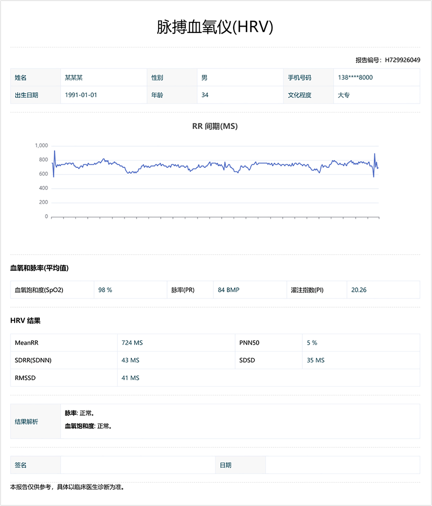 只需轻松夹戴手指,设备即可进行实时监测,所有数据自动同步至云端系统。通过对多项生理参数的连续采集与智能分析,系统能够自动生成详尽的健康监测报告,为用户提供关于压力状态、恢复水平及身心健康的综合评估与趋势洞察,助力实现从单一指标监测到全面健康管理的跨越。