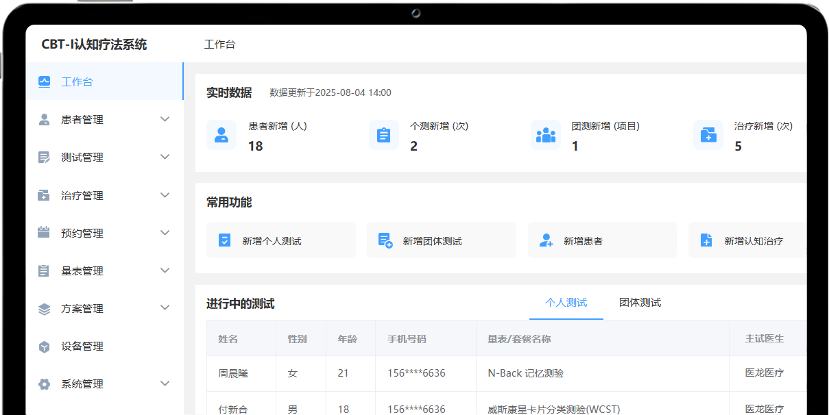 支持PC端创建或批量导入患者账号,档案集成测评报告、治疗及预约等记录。