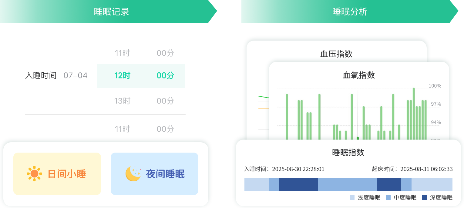 睡眠记录功能支持灵活设置记录日期与周期,既可手动记录,也可通过智能设备自动采集呼吸、血氧、血压等多维度数据。系统自动分析睡眠质量,并基于个人基线数据生成行为改善建议,助力用户改善睡眠习惯,提升治疗依从性。