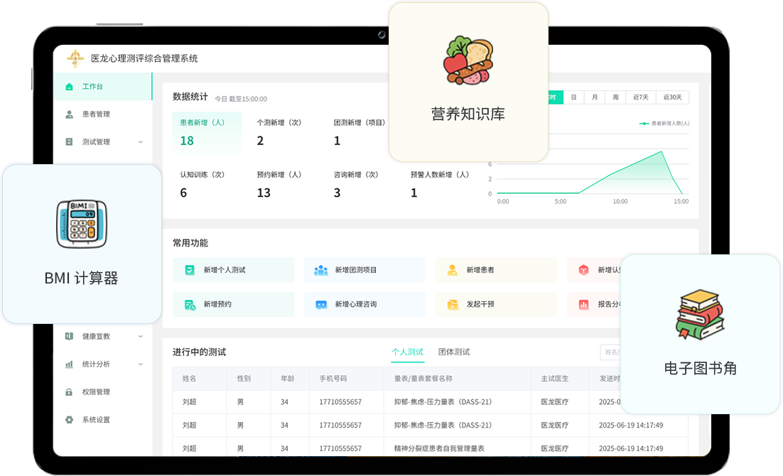 心理测评管理系统基于刘仁刚博士团队的专业研究基础,深度融合临床业务场景需求开发而成。系统通过标准化、可量化的科学评估工具,精准呈现个体心理健康水平,为教育、医疗、司法、企事业及军事领域提供循证决策支持。独创的智能量表推荐引擎,可依据测评对象特征自动匹配适配项目;极简操作界面与多模式测评方式(个体/团体),显著提升临床工作效率与用户体验。