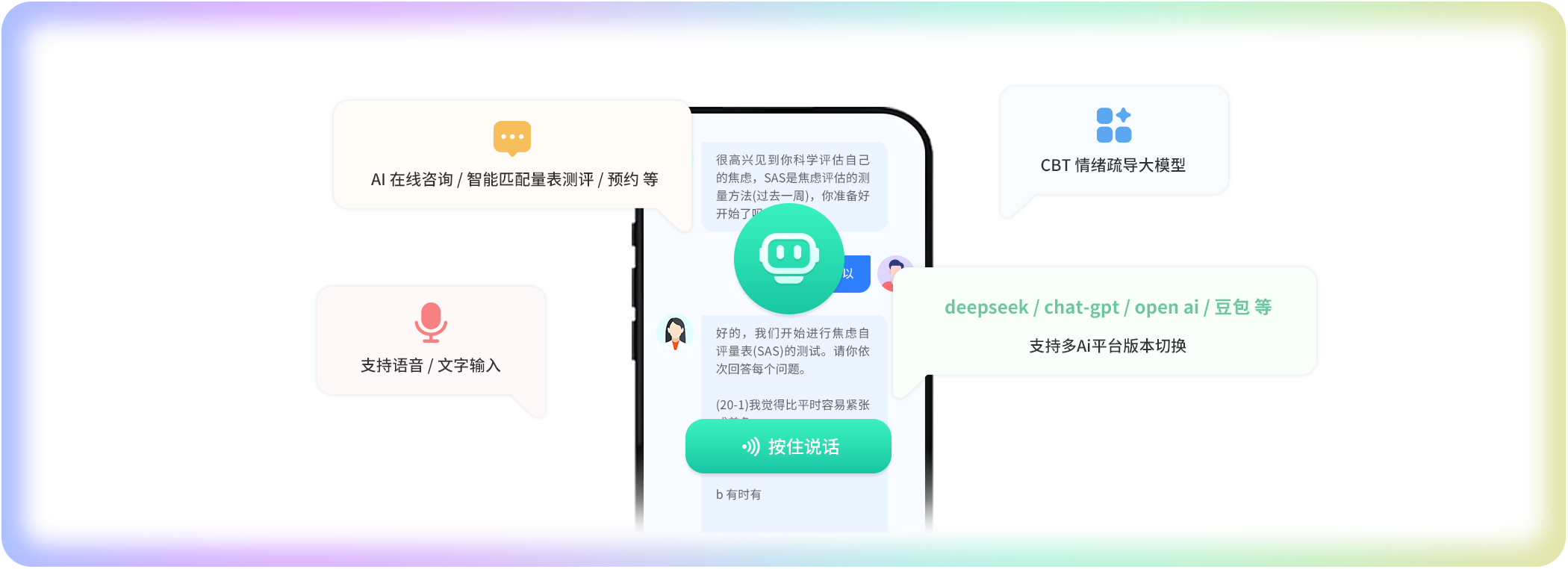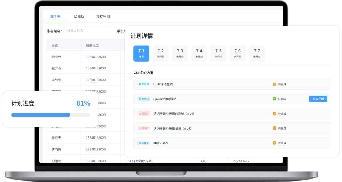 该系统是为适应学科行业发展,解决心理治疗康复过程中的业务需求而量身打造的,业务贯穿整个心理治疗康复全流程,涵盖有AI在线咨询、在线预约、心理测评、心理预警、健康宣教、认知治疗、物联治疗 (音乐放松耳机、ECS睡眠治疗仪、HRV血氧仪、体征监测手表) 等于一体的综合心理治疗康复管理系统,满足科室在门诊和住院开展的全部场景需求,支持团体治疗模式,支持数据统一管理,极大方便了临床的业务开展和心理治疗的统筹管理,提高临床治疗效果。